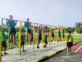 Sebelum melaksanakan latihan bela diri, para prajurit diwajibkan melakukan pemanasan lari keliling lapangan dan pull up.