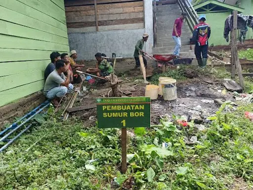 pembuatan sumur bor yang dikerjakan prajurit dalam rangka TNI Manunggal Membangun Desa (TMMD) dibantu oleh masyarakat, Dansatgas optimis dengan kerjasama tersebut pekerjaannya bisa selesai sesuai target.
