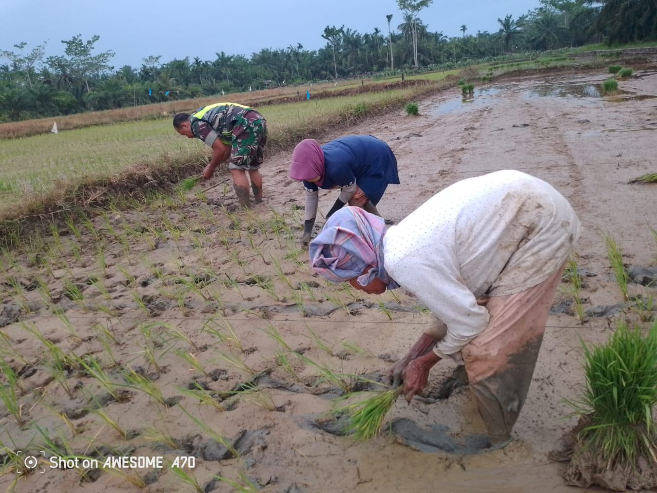 Babinsa Koramil 04/Bendahara jajaran Kodim 0117/Aceh Tamiang Sertu Endri Syahputra melaksanakan kegiatan pendampingan dan membantu petani yang sedang menanam padi jenis Hibrida di lahan seluas ±4 Rante milik Ibu Hamidah di Desa Mesjid Sungai Iyu, Kecamatan Bendahara, Kabupaten Aceh Tamiang. Rabu (23/04/2025)